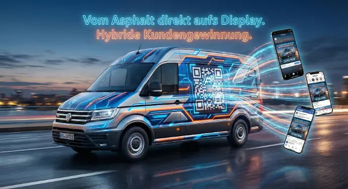 Wir kombinieren auffällige Digitaldruck-Folierungen mit hochgradig konvertierendem Programmatic Advertising. Das bedeutet: Wir machen Ihr Fahrzeug nicht nur schön, wir machen es intelligent. Über spezielle QR-Trigger und Social-Media-Retargeting (TikTok, Facebook, Instagram) bauen wir einen Trichter, der Interessenten (Neukunden + neue Talente) vollautomatisch findet und qualifiziert.